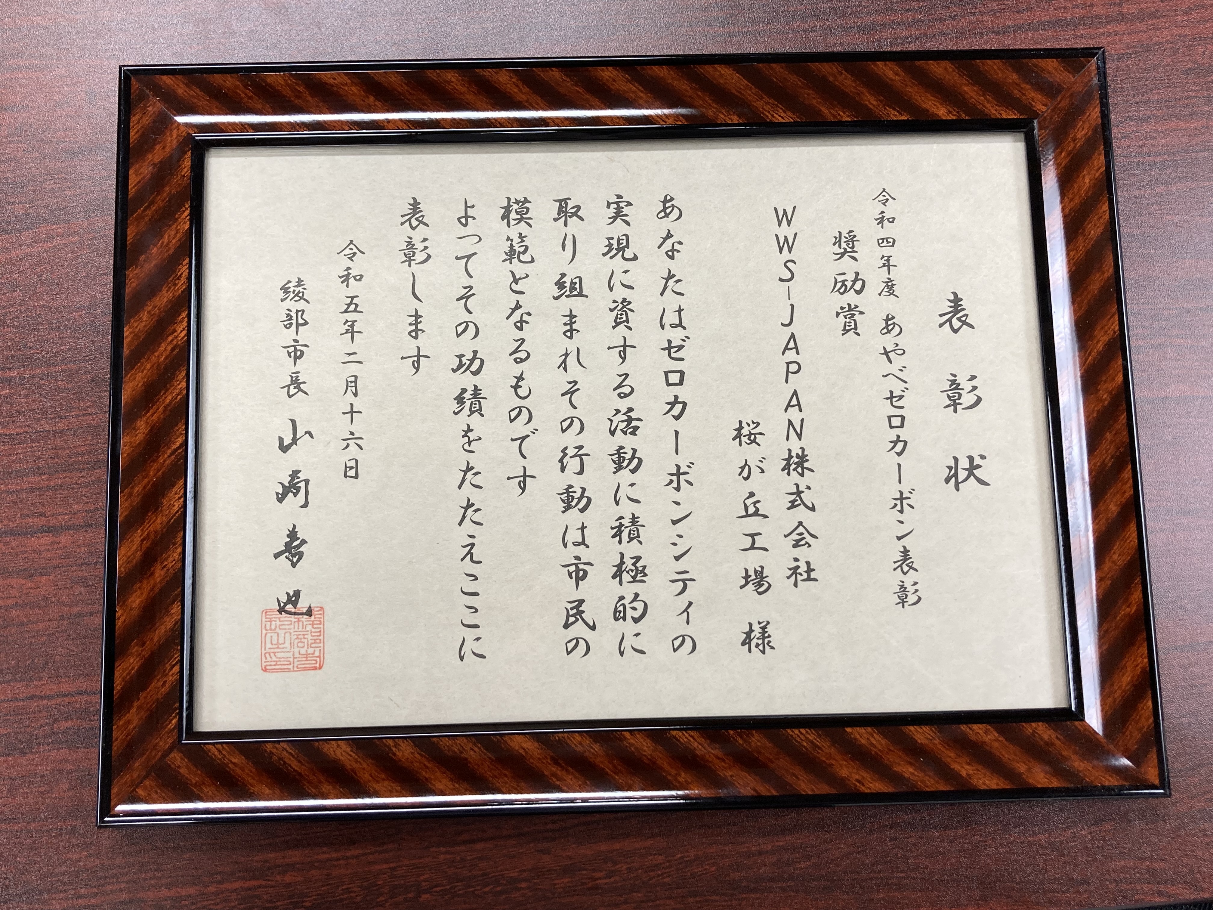 2023年2月16日、綾部市にある桜が丘工場での取組が綾部市「あやべゼロカーボン表彰」奨励賞に入賞しました。
